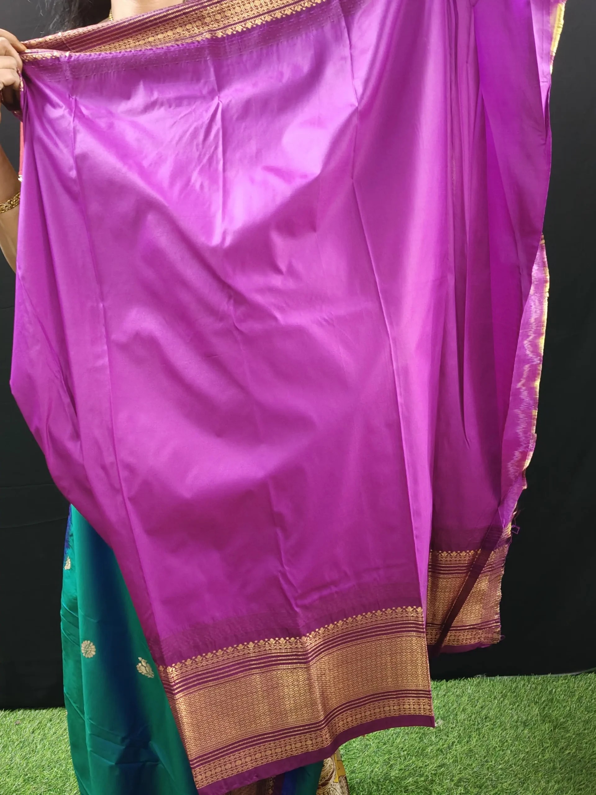 The Semi Gadwal Saree brings together the timeless craftsmanship of traditional Gadwal sarees with a lighter, more wearable fabric. With its signature contrast borders, rich zari weaving, and effortless drape, this saree is perfect for women who seek grace and grandeur without the weight of a pure silk saree.